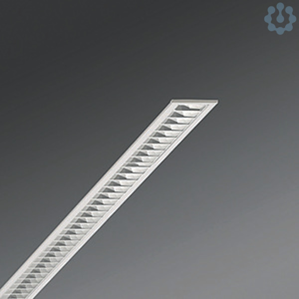 Stahlblechgehäuse geeignet für ausgeschnittene Decken und Paneeldecken, vorbereitet zum Befestigen von Stirnseiten oder zur Montage im Lichtband, weiß beschichtet, ähnlich RAL 9016, Lichtverteilung direkt strahlend mittels reflexionsverstärktem MIRO® Aluminium-Micro-Parabolraster seidenmatt mit Niederquerschnitts-Lamellen, Lichtreflexionsgrad 97%, für Bildschirmarbeitsplätze, 65° < 1500 cd/qm rundumentblendet nach aktueller Norm DIN-EN 12464-1, selbstrastend, bei Lichtbandmontage Raster optisch durchlaufend, Elektrischer Anschluss über 3-polige Anschlussklemme in Steckkontakt-Technik. Treiber integriert.