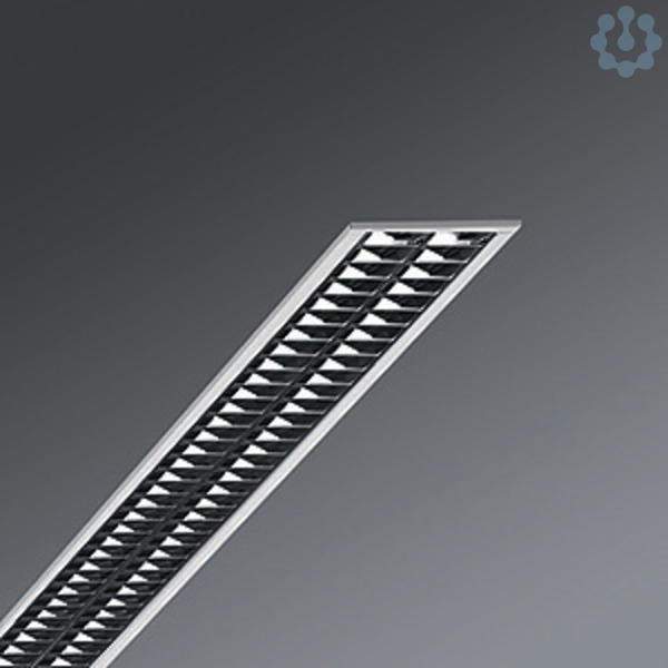 Stahlblechgehäuse geeignet für ausgeschnittene Decken und Paneeldecken, vorbereitet zum Befestigen von Stirnseiten oder zur Montage im Lichtband, weiß beschichtet, ähnlich RAL 9016, Lichtverteilung direkt strahlend mittels reflexionsverstärktem Aluminium-Parabolraster mit Reinstsilber-Beschichtung, hochglänzend in Darklight-Spiegeloptik mit Niederquerschnitts-Lamellen, Lichtreflexionsgrad 97%, für Bildschirmarbeitsplätze, 65° < 1000 cd/qm rundumentblendet nach aktueller Norm DIN-EN 12464-1, selbstrastend, bei Lichtbandmontage Raster optisch durchlaufend, Elektrischer Anschluss und Anschluss der Steuerleitung über 5-polige Anschlussklemme in Steckkontakt-Technik.