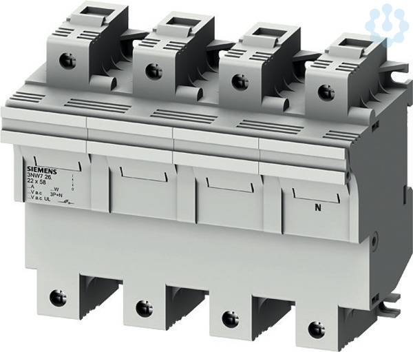 SENTRON, Zylindersicherungshalter, 22x58 mm, 3P+N, In: 100 A, Un AC: 690 V, LED Signalmelder SENTRON Zylindersicherungssystem für den selektiven Anlagenschutz. Siemens Zylindersicherungseinsätze und -sicherungshalter sind für den Einsatz in industriellen Anlagen geeignet. Sie sind in Europa Standard und als Sicherungstrennschalter geprüft und zugelassen aber nicht zum Schalten unter Last vorgesehen. Für das Schalten unter Last bietet Siemens ein umfangreiches Portfolio z.B. 3KF an. Die Siemens Zylindersicherungssysteme zeichnen sich vor allem aus durch: 1. Erfüllung der Normen IEC 60269-1, -2 und -3. 2. Erfüllung der Norm UL 512. 3. Schnellen Sicherungswechsel durch Platz für Ersatzsicherungen im Einschub. 4. Schnelles Erkennen der ausgelösten Sicherung durch blinkende LED im Falle der Auslösung.