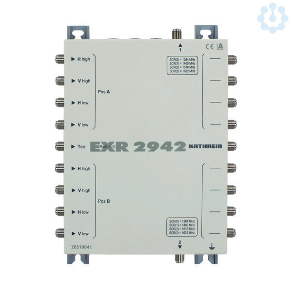 EXR 2942 Einkabel-Multischalter 9 auf 2x4 Durchg.Einkabel-Multischalter 9 auf 2x4 Durchgang,5-862 und 8 x 950-2150 MHz, 8 Durchschleif-/2Ausg. für je 4 Receiver, F-Anschl., kaskadierbarAnschlußdämpfung terr.: 11 dB, Verstärkung SAT:0->3 dB, Durchgangsdämpfung: SAT 2,0 dB,terr. 2,5 dB, Entkopplung: Stamm: > 40 dB,Steuerung: entsprechend EN 50494