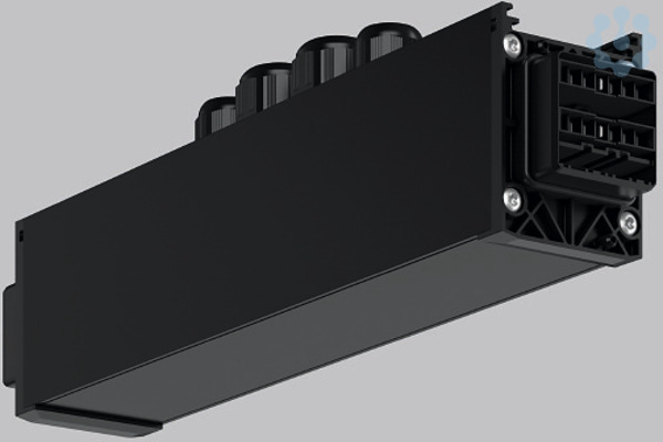 Mitteleinspeisung, 14-polig, Anschluss Buchse / Stecker. Gehäuse Aluminium-Strangpressprofil pulverbeschichtet. Abdeckung Kunststoff in Gehäusefarbe. LINEDO Steckersystem aus Kunststoff schwarz. 4 Kabelverschraubungen (2 x M20 und 2 x M25). Kabelverschraubungen oben. Komfortabler Anschluss für starre und flexible Leitungen.