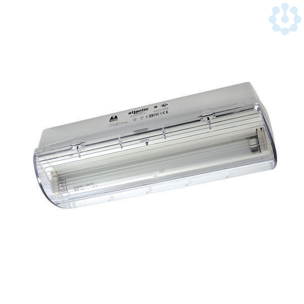 Einzelbatterieleuchte inkl. klarer Abdeckhaube, 3 Piktogrammfolien (Pfeil links, rechts und unten) gem. ISO 7010 sowie einer grünen LED für die Ladekontrollanzeige. Funktionstest nur über externen Prüftaster möglich.