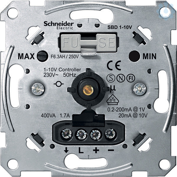 mit Druckausschalter Zum Ansteuern dimmbarer elektronischer Vorschaltgeräte (EVG) Mit Druckausschalter 230 V. 50 Hz. 6 A (Einschaltströme der EVGs beachten). mit Minimum- Einstellung. Memoryfunktion Steuerspannung: 1-10 VDC Steuerstrom: max. 200 mA Schmelzsicherung: 6,3 A Typ: SBD1-10.