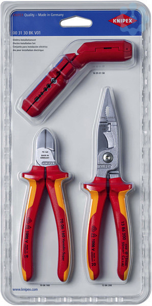 00 31 30 BK V01 Elektro-Installationsset Dieses Set stattet das Elektro-Handwerk für praktisch jede alltägliche Arbeit aus. Das Universal-Abmantelungswerkzeug KNIPEX ErgoStrip®, die enorm vielseitige Elektro-Installationszange mit Kabelschere und der kraftvolle Seitenschneider bilden ein perfektes Team!. Lieferumfang: 1 x 13 86 200 KNIPEX Elektro-Installationszange (Ø 15 mm / 50 mm²), 1 x 16 95 01 SB KNIPEX ErgoStrip® Universal-Abmantelungswerkzeug (Ø 8,0 – 13,0 mm), 1 x 70 06 160 KNIPEX Seitenschneider,
