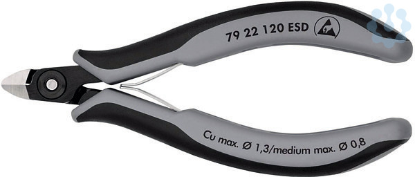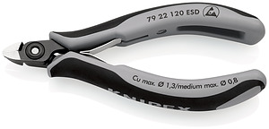 79 22 120 ESD Präzisions-Elektronik-Seitenschneider ESD Griffe elektrisch ableitend – dissipativ. Präzisionszangen für feinste Schneidarbeiten, z. B. in Elektronik und Feinmechanik. Sehr genau geschliffene, scharfe Schneiden mit sehr kleinen Facetten für exakte Schnitte an empfindlichen Elektronik-Bauteilen; auch ohne Facette für bündiges Schneiden. Präzisions-Schneiden zusätzlich induktiv gehärtet, Schneidenhärte ca. 64 HRC. Ca. 20 % weniger Gewicht als konventionelle Elektronikzangen. Geschraubtes Gelenk mit besonders sorgfältig gefertigten Gelenkflächen für gleichmäßige, reibungsarme Bewegung im gesamten Öffnungsbereich. Leichtgängige Doppelfeder für ein sanftes und gleichmäßiges Öffnen. Ergonomisch optimierte Mehrkomponenten-Hüllen. Mini-Kopf. - Schneidwerte mittelharter Draht (Durchmesser): Ø 0,8mm - Schneidwerte weicher Draht (Durchmesser): Ø 0,1 – 1,3mm - Backenlänge (B): 6,5mm - Backendicke (am Gelenk) (D): 6,5mm - Kopfbreite (A): 9mm - ESD: Ja