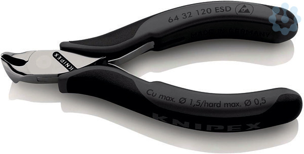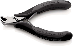 64 32 120 ESD Elektronik-Vornschneider ESD Präzisionszangen für feinste Schneidarbeiten, z. B. in Elektronik und Feinmechanik. Griffe elektrisch ableitend – dissipativ. Durchgestecktes Präzisionsgelenk. Reibungsarme Doppelfeder für ein sanftes und gleichmäßiges Öffnen. Die Spiegelpolitur bietet in Verbindung mit einem feinen Ölfilm einen guten Rostschutz – keine Störungen im Schaltkreis durch abblätternde Chromteile. Schneiden zusätzlich lasergehärtet, Schneidenhärte mindestens 56 HRC. Griffe mit zweifarbigen Mehrkomponenten-Hüllen schwarz/grau. Vornschrägschneider, mit kleiner Facette, α=15°. - Schneidwerte weicher Draht (Durchmesser): Ø 1,5mm - Schneidwerte mittelharter Draht (Durchmesser): Ø 1,0mm - Schneidwerte harter Draht (Durchmesser): Ø 0,5mm - Kopfbreite (A): 11mm - Backenlänge (B): 10mm - Backendicke (am Gelenk) (D): 7mm - Schneidenlänge mm (C): 17mm - ESD: Ja