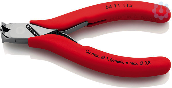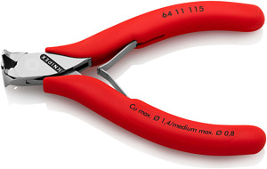 64 11 115 Elektronik-Vornschneider Präzisionszangen für feinste Schneidarbeiten, z. B. in Elektronik und Feinmechanik. Durchgestecktes Präzisionsgelenk. Reibungsarme Doppelfeder für ein sanftes und gleichmäßiges Öffnen. Die Politur oder Spiegelpolitur bietet in Verbindung mit einem feinen Ölfilm einen guten Rostschutz – keine Störungen im Schaltkreis durch abblätternde Chromteile. Schneiden zusätzlich lasergehärtet, Schneidenhärte mindestens 56 HRC. Vornschneider, ohne Facette. - Schneidwerte weicher Draht (Durchmesser): Ø 1,4mm - Schneidwerte mittelharter Draht (Durchmesser): Ø 0,8mm - Kopfbreite (A): 11mm - Backenlänge (B): 12mm - Backendicke (am Gelenk) (D): 7mm - Schneidenlänge mm (C): 16mm