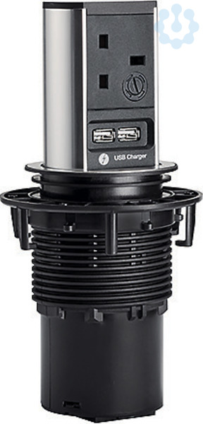 ELEVATOR Herausfahrbare Steckdoseneinheit Aluprofil eloxiert, 1xUK 5A 90° Steckdose, 1xUSB Doppelcharger 5V DC / 3,1A Zuleitung: 0,5m H05VV-F 3G1,5mm² schwarz mit GST18 Stecker, verpackt im Karton.