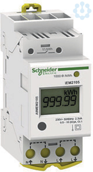 Acti 9 iEM2000 Baureihe. iEM2105 Energiezähler, 1-phasig. Ausgang_S0 ja, max. Strom 63, TE 2. Wechselstromzähler zur Direktmessung. Digitaleingang für Tarifumschaltung, Teilzähler mit Resetfunktion, erweiterte Messfunktion Wirk- & Blindenergie (Bezug & Abgabe), Strom, Spannung, Wirk- & Blindleistung, Leistungsfaktor, Frequenz bei kommunikativen Varianten. Genauigkeit Klasse 1 (IEC 62053-21 und IEC61557-12) bzw. Klasse B (EN50470-3). Kommunikationsoptionen M-Bus oder Modbus RTU (RS 485). Messgeräterichtlinie MID 2004/22/EG muss das Messgerät in einem Schrank oder Gehäuse mit Schutzart IP51 oder besser verbaut sein.