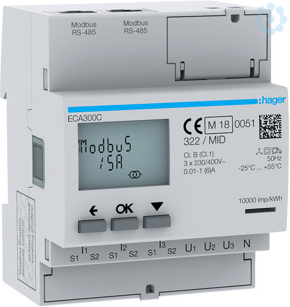 Energiezähler 3phasig für Wandlerverhältnis 1A oder 5A, 4M, AGARDIO, MID. Energiezähler zur 4-Quadrantenmessung mit folgenden Genauigkeitsklassen: Wirkenergie Class B nach DIN EN 50470-3, Wirkleistung Class 1 nach IEC 62053-21, Wirkleistung Class 1 nach IEC 61557-12 und Blindleistung Class 2 nach IEC 62053-23. Der Zweirichtungszähler wird ab Werk MID zertifiziert (ein Plombierset im Lieferumfang enthalten) und enthält einen rücksetzbaren Teilzähler. Zur Messung von Energiebezug- und Energielieferung in allen Netzsystemen geeignet. Bis zu 8 Tarifzählungen möglich (2 Tarifzählungen über 230 V AC und Modbus, zusätzlich 6 Tarifzählungen über Modbus ansteuerbar). Digitales Display mit Beleuchtung zur Anzeige von bezogener und gelieferter Wirk- (kWh) und Blindenergie (kvarh) für alle Tarife. Zusätzlich werden je Außenleiter die Echtzeitmesswerte für Wirkleistung (kW), Blindleistung (kvar), Scheinleistung (kVA), Spannung (V), Strom (A), Leistungsfaktor, Frequenz (Hz) und Tarif in einer Auflösung bis zu 9 Stellen inklusive zwei Nachkommastellen angezeigt. Neben den zuvor genannten Messwerten können über Modbus auf die aktuellen Summen-Messwerte von Wirkleistung (kW), Blindleistung (kvar) und Scheinleistung (kVA) so wie den Leistungsfaktor zugegriffen werden. Außerden können die Werte des Teilzählers für Wirkenergie von jedem Tarif über Modbus einzeln zurückgesetzt werden. Alle Messwerte und Energiewerte für Tarif1 und Tarif2 können zusätzlich über eine IR-Schnittstelle ausgegeben werden. Verdrahtungsfehler und Anschlussfehler werden angezeigt und die Messdaten werden periodisches abgespeichert. Durch RJ45-Stecktechnik ist eine fehlerfreie Daisy-Chain-Installation möglich.