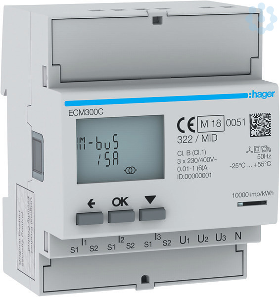 Energiezähler 3phasig für Wandlerverhältnis 1A oder 5A, 4M, MBUS, MID. Energiezähler zur 4-Quadrantenmessung mit folgenden Genauigkeitsklassen: Wirkenergie Class B nach DIN EN 50470-3, Wirkleistung Class 1 nach IEC 62053-21, Wirkleistung Class 1 nach IEC 61557-12 und Blindleistung Class 2 nach IEC 62053-23. Der Zweirichtungszähler wird ab Werk MID zertifiziert (ein Plombierset im Lieferumfang enthalten) und enthält einen rücksetzbaren Teilzähler. Zur Messung von Energiebezug- und Energielieferung in allen Netzsystemen geeignet. 2 Tarifzählungen über 230 V AC oder Mbus ansteuerbar. Digitales Display mit Beleuchtung zur Anzeige von bezogener und gelieferter Wirk- (kWh) und Blindenergie (kvarh) für alle Tarife. Zusätzlich werden je Außenleiter die Echtzeitmesswerte für Wirkleistung (kW), Blindleistung (kvar), Scheinleistung (kVA), Spannung (V), Strom (A), Leistungsfaktor, Frequenz (Hz) und Tarif in einer Auflösung bis zu 9 Stellen inklusive zwei Nachkommastellen angezeigt. Neben den zuvor genannten Messwerten können über Mbus auf die aktuellen Summen-Messwerte von Wirkleistung (kW), Blindleistung (kvar) und Scheinleistung (kVA) zugegriffen werden. Alle Messwerte und Energiewerte für Tarif1 und Tarif2 können zusätzlich über eine IR-Schnittstelle ausgegeben werden. Verdrahtungsfehler und Anschlussfehler werden angezeigt und die Messdaten werden periodisches abgespeichert.