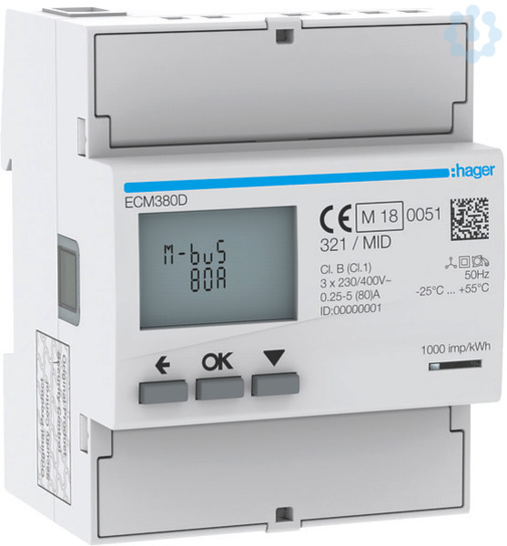 Energiezähler 3phasig, direkt 80A, 4M, MBUS, MID. Energiezähler zur 4-Quadrantenmessung mit folgenden Genauigkeitsklassen: Wirkenergie Class B nach DIN EN 50470-3, Wirkleistung Class 1 nach IEC 62053-21, Wirkleistung Class 1 nach IEC 61557-12 und Blindleistung Class 2 nach IEC 62053-23. Der Zweirichtungszähler wird ab Werk MID zertifiziert (ein Plombierset im Lieferumfang enthalten) und enthält einen rücksetzbaren Teilzähler. Zur Messung von Energiebezug- und Energielieferung in allen Netzsystemen geeignet. 2 Tarifzählungen über 230 V AC oder Mbus ansteuerbar. Digitales Display mit Beleuchtung zur Anzeige von bezogener und gelieferter Wirk- (kWh) und Blindenergie (kvarh) für alle Tarife. Zusätzlich werden je Außenleiter die Echtzeitmesswerte für Wirkleistung (kW), Blindleistung (kvar), Scheinleistung (kVA), Spannung (V), Strom (A), Leistungsfaktor, Frequenz (Hz) und Tarif in einer Auflösung bis zu 9 Stellen inklusive zwei Nachkommastellen angezeigt. Neben den zuvor genannten Messwerten können über Mbus auf die aktuellen Summen-Messwerte von Wirkleistung (kW), Blindleistung (kvar) und Scheinleistung (kVA) zugegriffen werden. Alle Messwerte und Energiewerte für Tarif1 und Tarif2 können zusätzlich über eine IR-Schnittstelle ausgegeben werden. Verdrahtungsfehler und Anschlussfehler werden angezeigt und die Messdaten werden periodisches abgespeichert.