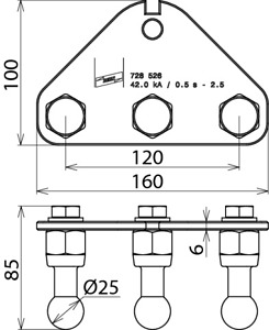 Erdanschlussplatte zur Montage auf Erdanschlussklemme mit Verdrehungsschutz PK1 und mit 3 Kugelfestpunkten als Anschließstelle nach DIN VDE 0683-100 (EN/IEC 61230). Einfacher Anschluss der Phasenäste einpolig. Hohe Kurzschlussstromträgfähigkeit.