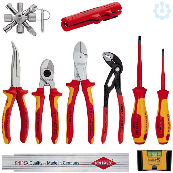 00 20 90 V01 Erweiterungsset Elektro 1 Lieferumfang: 1 x 00 11 01 KNIPEX TwinKey® Schaltschrankschlüssel für gängige Schränke und Absperrsysteme, 1 x 95 16 165 KNIPEX Kabelschere (Ø 15 mm / 50 mm²), 1 x 87 01 180 KNIPEX Cobra® Hightech-Wasserpumpenzange, 1 x 16 80 125 SB KNIPEX Universal-Abmantelungswerkzeug (Ø 8,0 – 13,0 mm), 1 x 74 06 200 KNIPEX Kraft-Seitenschneider, 1 x 98 25 01 SLS KNIPEX Schraubendreher (Slim) PlusMinus Pozidriv® (PZ/S 1), 1 x 98 25 02 SLS KNIPEX Schraubendreher (Slim) PlusMinus Pozidriv® (PZ/S 2), 1 x 26 26 200 KNIPEX Flachrundzange mit Schneide (Storchschnabelzange), 1 x 18115 Stabila Mini-Wasserwaage Pocket Electric (68 mm), 1 x L240 00055 Knipex Zollstock Stabila Serie 400 (200 mm),