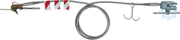 Einpolige Erdungs- und Kurzschließvorrichtung nach DIN VDE 0683-100 (EN/IEC 61230) für Oberleitungen elektrischer Bahnen,; 12 m lang mit Einhängehaken, mit Fahrdraht-Erdungsklemme und Schienenanschlussklemme (Knebel) bestückt.