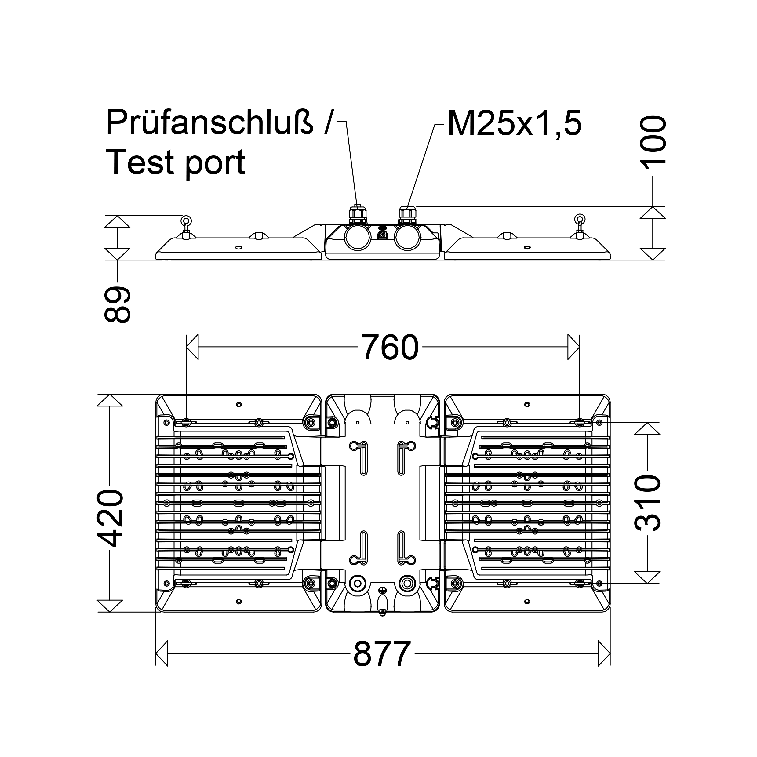 EX-LED-Hallenleuchte, ExDUEVO, EX-Zone 2/22, 270 W, 40400 lm, SKI, IP65, tief-breitstrahlend, 4000 K, Ra≥ 80, Ta -20 °C/+40 °C, L70>100000 h (@Ta ≤50°C), L70>90000 h (@Ta >50°C), L80>100000 h (@Ta 25°C), L80>60000 h (@ Ta max), DALI (DIMD), Scheibe Sicherheitsglas klar, Verschluss Edelstahl (1.4301), Gehäuse Alu-Druckguss, Lackiert, Farbe grau, DB 702, EAN/GTIN:4041254325354.Explosionsgeschützte LED-Hallenleuchte ExDUEVO für Zone 2/22. Gehäuse aus Aluminiumdruckguss, mehrteilig, thermisch getrennt, pulverlackiert, bestehend aus: Gerätegehäuse mit eingebautem Betriebsgerät und glatter Oberfläche sowie zwei LED-Gehäusen mit LED-Modulen, rahmenlosen flachen Sicherheitsgläsern, thermisch gehärtet, Gehäuseoberseiten mit flacher Kühlrippenstruktur. LED-Module direkt strahlend, Multi-Layer-Technologie, mit direkter Anbindung an das Gehäuse zur Gewährleistung eines optimalen Thermomanagements. EVG mit Überspannungs-, Überlast-, Übertemperatur- und Kurzschlussschutz sowie DALI-Schnittstelle für Dimmbetrieb.