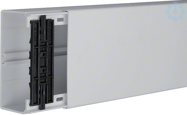 Leitungsführungskanal mit Geräte/Trennwandeinbauoption PVC FB 60x130 lichtgrau.Elektro-Installationskanal-System Leitungsführungskanal, aus Kunststoff nach DIN EN 50085-1 zur Leitungsverlegung mit Geräteeinbaumöglichkeit. Kanalunterteil/-oberteil mit vorgestanzter Bodenlochung im Abstand von 125 mm, Rückhalteklammern und Trennwandeinbaumöglichkeit.