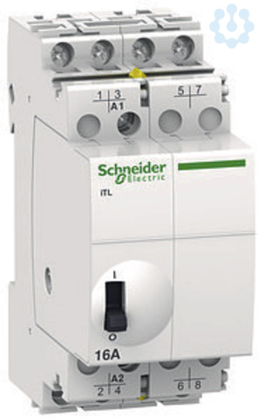 Fernschalter Acti 9 iTL. 4-polig, 4 Schließer, Nennstrom 16A, Steuerspannung (Uc) 230-240V AC / 110V DC. Fernschalter zum Schalten von Beleuchtungsstromkreisen mit einem oder mehreren Tastern. Breite in TE 1.