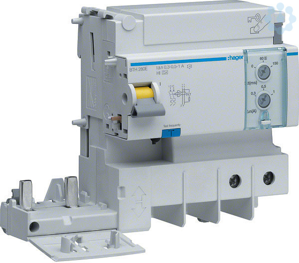 Fehlerstromblock 2polig 125A Fehlerstrom einstellbar Type HI.FI-Block Typ A HI (pulsstromsensitiv und High Immunity) nach DIN EN 61009-1 (VDE 0664-20) anbaubar an Leitungsschutzschalter. Mit Klemmkraftverstärkung und Hutschienen-Clip mit zwei Haltepositionen. Gerät ist plombierbar.