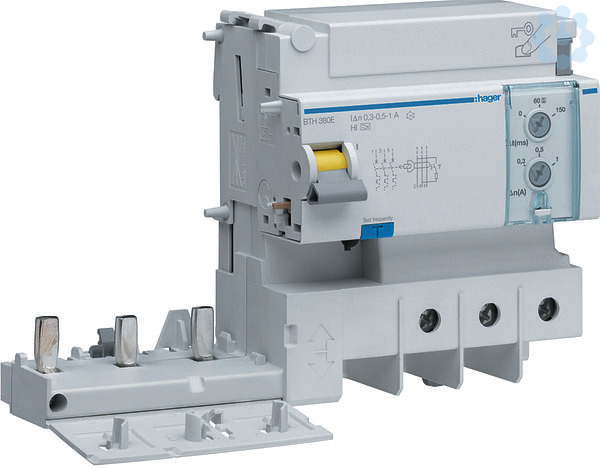 Fehlerstromblock 3polig 125A Fehlerstrom einstellbar Type HI.FI-Block Typ A HI (pulsstromsensitiv und High Immunity) nach DIN EN 61009-1 (VDE 0664-20) anbaubar an Leitungsschutzschalter. Mit Klemmkraftverstärkung und Hutschienen-Clip mit zwei Haltepositionen. Gerät ist plombierbar.