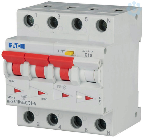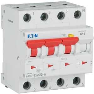 FI/LS Kombischalter, mRB6, 3-polig+N, Bemessungsstrom In: 10 A, Bemessungsfehlerstrom: 0,1 A, Bemessungsschaltvermögen nach IEC/EN 60947-2: 6 kA, Bemessungsschaltvermögen nach IEC/EN 61009: 6 kA, Schaltgeräte für Wohn- und Zweckbau