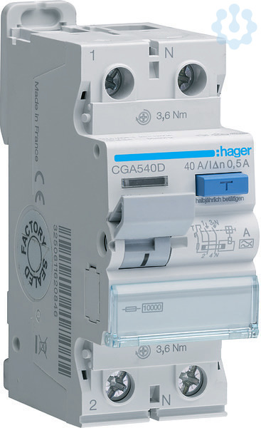 Fehlerstromschutzschalter 2 polig 10kA 40A 500mA Typ A.Fehlerstrom-Schutzschalter (FI) nach DIN EN 61008-1 (VDE 0664-10), DIN EN 61008-2-1 (VDE 0664-11) mit Bi-Connect-Klemmen unten, externe blaue Test-Taste und Fehlerstromanzeige. Geeignet zum nachträglichen Anbau von Zusatzeinrichtungen. Anschlussklemmen mit Draht-Einschiebe-Schutz, Beschriftungsmöglichkeit direkt am Gerät.