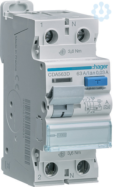 Fehlerstromschutzschalter 2 polig 10kA 63A 30mA Typ A.Fehlerstrom-Schutzschalter (FI) nach DIN EN 61008-1 (VDE 0664-10), DIN EN 61008-2-1 (VDE 0664-11) mit Bi-Connect-Klemmen unten, externe blaue Test-Taste und Fehlerstromanzeige. Geeignet zum nachträglichen Anbau von Zusatzeinrichtungen. Anschlussklemmen mit Draht-Einschiebe-Schutz, Beschriftungsmöglichkeit direkt am Gerät.