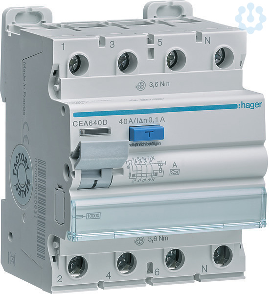 Fehlerstromschutzschalter 4 polig 10kA 40A 100mA Typ A. Fehlerstrom-Schutzschalter (FI) nach DIN EN 61008-1 (VDE 0664-10), DIN EN 61008-2-1 (VDE 0664-11) mit Bi-Connect-Klemmen unten, externe blaue Test-Taste und Fehlerstromanzeige. Geeignet zum nachträglichen Anbau von Zusatzeinrichtungen. Anschlussklemmen mit Draht-Einschiebe-Schutz, Beschriftungsmöglichkeit direkt am Gerät.