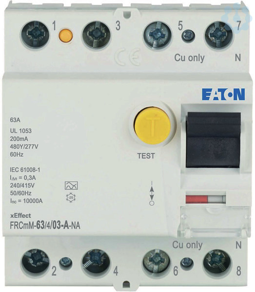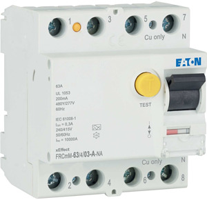 Fehlerstromschutzschalter FRCmM-NA, 4-polig, Bemessungsstrom In: 63 A, Bemessungskurzschlussfestigkeit Icn: 10 mit Vorsicherung kA, Bemessungsfehlerstrom IΔN: 0,3 A, Schaltgeräte für den Export nach Nordamerika (UL zertifiziert)