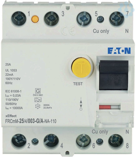 Fehlerstromschutzschalter FRCmM-NA-110, 4-polig, Bemessungsstrom In: 25 A, Bemessungskurzschlussfestigkeit Icn: 10 mit Vorsicherung kA, Bemessungsfehlerstrom IΔN: 0,03 A, Schaltgeräte für 110-V-Systeme