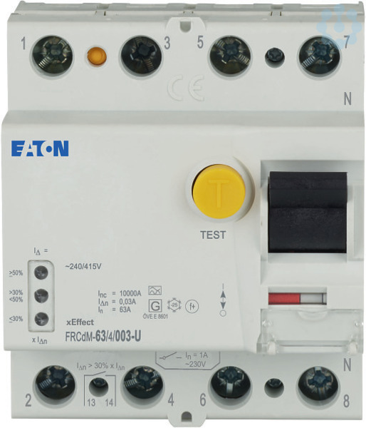 Fehlerstromschutzschalter FRCdM, 4-polig, Bemessungsstrom In: 63 A, Bemessungskurzschlussfestigkeit Icn: 10 mit Vorsicherung kA, Bemessungsfehlerstrom IΔN: 0,03 A, Fehlerstromschutzschalter - umrichterfest