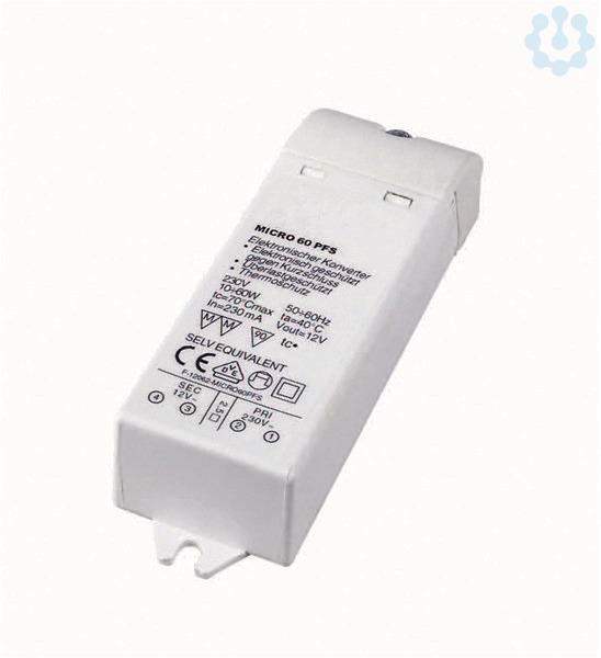 Dimmbarer, elektronischer 12V Niedervolttransformator mit Schraubklemmanschluss und einer Leistung von 10-60W.