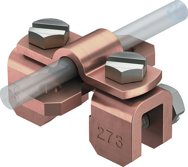 Falzklemme für Blechstärke bis 10 mm, Leitungsführung quer und längs zum Blech mit 2 Sechskantschrauben M8 x 10 und 2 Sechskantschrauben M8 x 16 aus rostfreiem Stahl (VA).