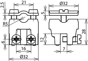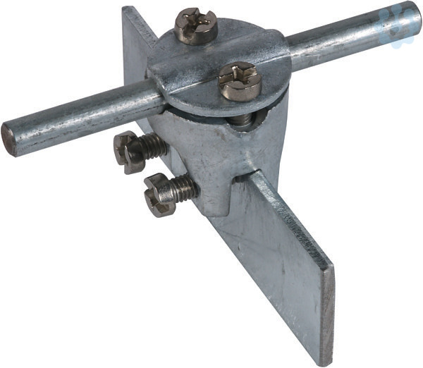 Falzklemme nach DIN EN 62561-1, zum Verbinden von Rundleitern mit Falzen. Ausführung mit Zweischrauben-Überleger z.B. für Stehfalze, Leitungsführung längs oder quer.