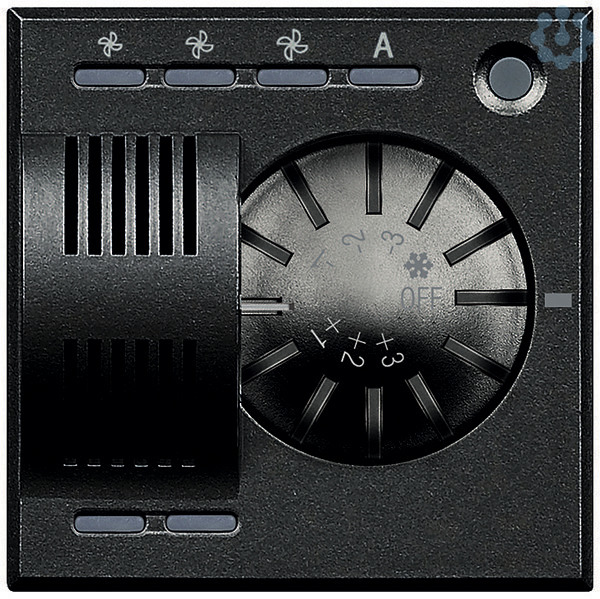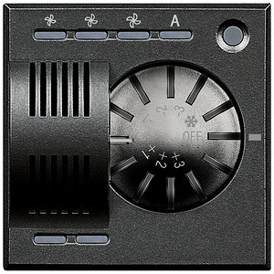 Raumthermostat für Fan-Coils mit Stellrad zum manuellen Veränder der Solltemperatur um ±3 °C, Frostschutz und Aus, Taste Lüftergeschwindigkeit, Messbereich 3–40 °C, Kontroll-LEDs für Betrieb, Lüftergeschwindigkeit und Heizen/Kühlen, Farbe: Anthrazit