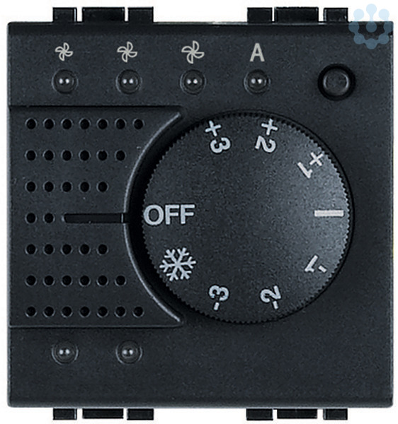 Raumthermostat für Fan-Coils mit Stellrad zum manuellen Veränder der Solltemperatur um ±3 °C, Frostschutz und Aus, Taste Lüftergeschwindigkeit, Messbereich 3–40 °C, Kontroll-LEDs für Betrieb, Lüftergeschwindigkeit und Heizen/Kühlen, Farbe: Anthrazit