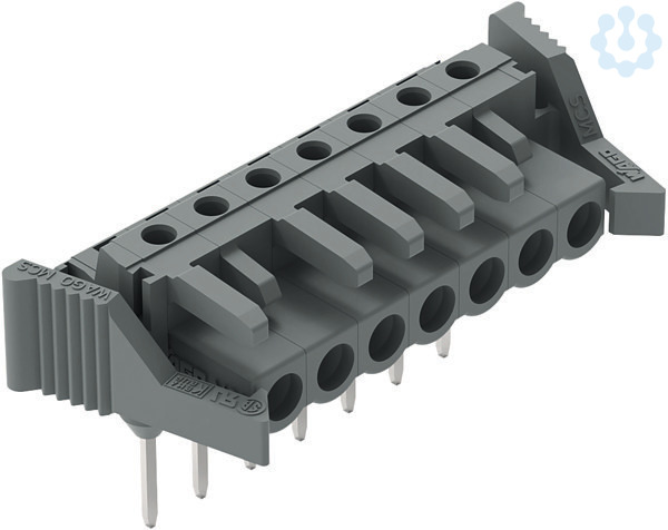 Federleiste für Reihenklemmen; Stifte 0,6 x 1 mm; abgewinkelt; Verriegelungsklinke; Rastermaß 5 mm; 7-polig; grau