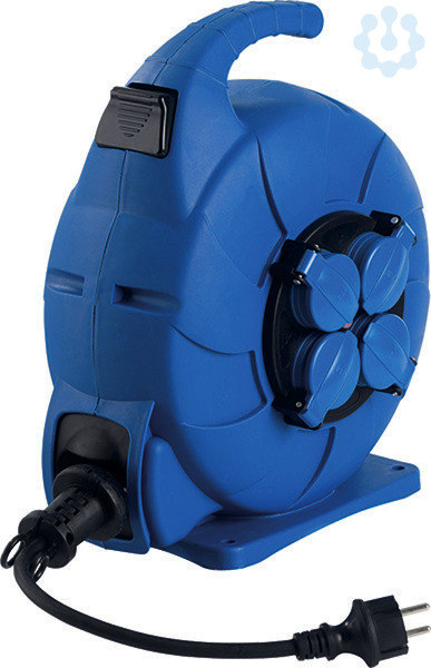 Mobile Federzug-Kabeltrommel 4-fach mit Rückholautomatik Farbe: Blau 4fach Steckdoseneinsatz mit Klappdeckel Strom: 15m H07RN-F 3G1,5 mit Schutzkontaktstecker 230V / 16A / max. 3500W abgerollt und 1000W aufgerollt VDE-Thermoschutzschalter mit Kunststoff-Handgriff. mit Kunststoff-Handgriff.