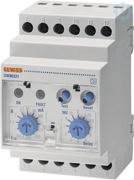 Fehlerstrom- Steuerrelais als Reiheneinbaugeraet. Der Bemessungsfehlerstrom ist einstellbar <0.03-0.05-0.15-0.23-0.3-0.5-1-1.5-2-3 A>. Die Ausloesezeit ist einstellbar <0-0.25-1-2-3-4-5-6-7-8-10 s>. Die Einstellpotentiometer befindet sich unter transparenten, plombierbaren Abdeckung. Zum Betrieb werden zusaetzlich noch ein Summenstromwandler und ein geeignete Schalteinrichtung zur Lastschaltung benoetigt. Die Ansteuerung der Schalteinrichtung erfolgt ueber einen potenzialfreien Wechsler 10A. Anschluss (max); 6 qmm.