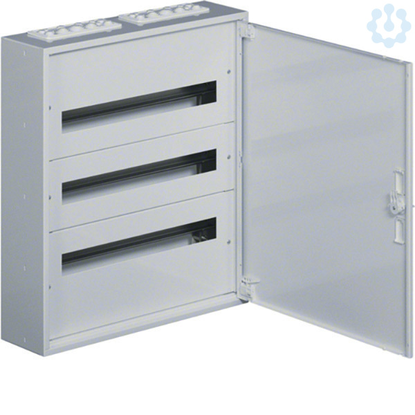Installationsverteiler,AP,IP40,SKI,,3x24PLE,Außenmaße (HxBxT):641x571x150mm. Installationsverteiler AP nach OVE/ÖNORM EN 61 439-1/-3 und OVE/ÖNORN 62208. Zum Einbau für Reiheneinbaugeräte bis 125 A. Bestehend aus Schrank mit Tür aus reinweißen pulverbeschichtetem und eingebranntem Stahlblech. Der Einbausatz hat je 2 profilierte Tragschienen, stabile 15mm hohen Hutschienen in 150mm Mittenabstand und passenden reinweißen Berührungsschutzabdeckungen. Großzügiger Raum für die zu- und abgehenden Kabel durch je einen 200mm hohen Bereich. Vorprägungen für die Kabeleinführungen unten, oben sowie seitlich. Tür mit innenliegenden justierbaren Scharnieren und einem Öffnungswinkel von 130°. Tür rechts und links anschlagbar. Weißes formschönes Schlossschild mit Drehriegel - Klappverschluss. Austauschbare Schließsysteme, Kabelabfangschienen sowie verschiedene Klemmen siehe Zubehör.