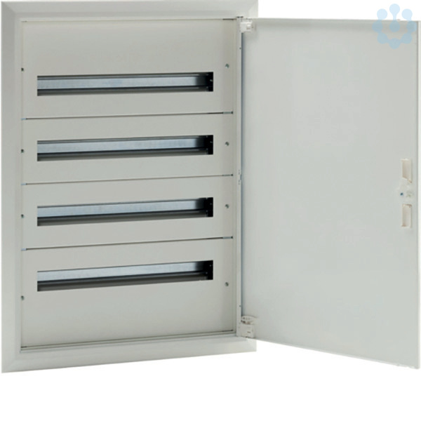 Installationsverteiler,AP,IP40,SKI,4x24PLE,Außenmaße (HxBxT):791x571x150mm. Installationsverteiler AP nach OVE/ÖNORM EN 61 439-1/-3 und OVE/ÖNORN 62208. Zum Einbau für Reiheneinbaugeräte bis 125 A. Bestehend aus Schrank mit Tür aus reinweißen pulverbeschichtetem und eingebranntem Stahlblech. Der Einbausatz hat je 2 profilierte Tragschienen, stabile 15mm hohen Hutschienen in 150mm Mittenabstand und passenden reinweißen Berührungsschutzabdeckungen. Großzügiger Raum für die zu- und abgehenden Kabel durch je einen 200mm hohen Bereich. Vorprägungen für die Kabeleinführungen unten, oben sowie seitlich. Tür mit innenliegenden justierbaren Scharnieren und einem Öffnungswinkel von 130°. Tür rechts und links anschlagbar. Weißes formschönes Schlossschild mit Drehriegel - Klappverschluss. Austauschbare Schließsysteme, Kabelabfangschienen sowie verschiedene Klemmen siehe Zubehör.