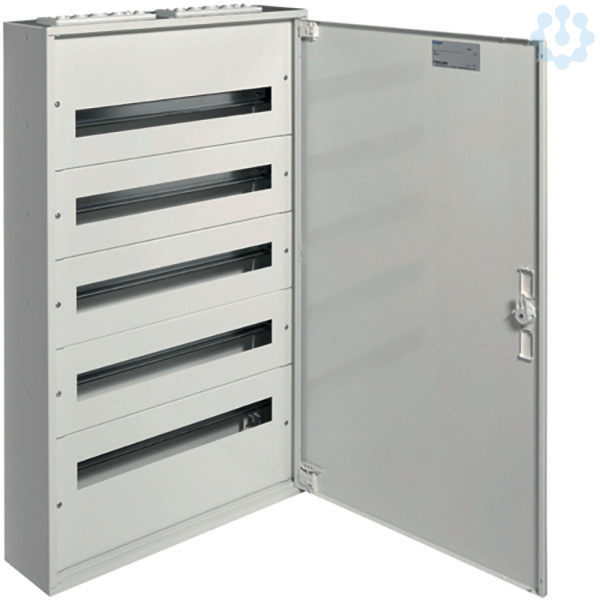 Installationsverteiler,AP,IP40,SKI,5x24PLE,Außenmaße (HxBxT):941x571x150mm. Installationsverteiler AP nach OVE/ÖNORM EN 61 439-1/-3 und OVE/ÖNORN 62208. Zum Einbau für Reiheneinbaugeräte bis 125 A. Bestehend aus Schrank mit Tür aus reinweißen pulverbeschichtetem und eingebranntem Stahlblech. Der Einbausatz hat je 2 profilierte Tragschienen, stabile 15mm hohen Hutschienen in 150mm Mittenabstand und passenden reinweißen Berührungsschutzabdeckungen. Großzügiger Raum für die zu- und abgehenden Kabel durch je einen 200mm hohen Bereich. Vorprägungen für die Kabeleinführungen unten, oben sowie seitlich. Tür mit innenliegenden justierbaren Scharnieren und einem Öffnungswinkel von 130°. Tür rechts und links anschlagbar. Weißes formschönes Schlossschild mit Drehriegel - Klappverschluss. Austauschbare Schließsysteme, Kabelabfangschienen sowie verschiedene Klemmen siehe Zubehör.
