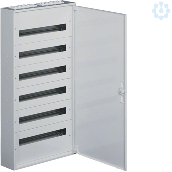 Installationsverteiler,AP,IP40,SKI,6x24PLE,Außenmaße (HxBxT):1091x571x150mm. Installationsverteiler AP nach OVE/ÖNORM EN 61 439-1/-3 und OVE/ÖNORN 62208. Zum Einbau für Reiheneinbaugeräte bis 125 A. Bestehend aus Schrank mit Tür aus reinweißen pulverbeschichtetem und eingebranntem Stahlblech. Der Einbausatz hat je 2 profilierte Tragschienen, stabile 15mm hohen Hutschienen in 150mm Mittenabstand und passenden reinweißen Berührungsschutzabdeckungen. Großzügiger Raum für die zu- und abgehenden Kabel durch je einen 200mm hohen Bereich. Vorprägungen für die Kabeleinführungen unten, oben sowie seitlich. Tür mit innenliegenden justierbaren Scharnieren und einem Öffnungswinkel von 130°. Tür rechts und links anschlagbar. Weißes formschönes Schlossschild mit Drehriegel - Klappverschluss. Austauschbare Schließsysteme, Kabelabfangschienen sowie verschiedene Klemmen siehe Zubehör.