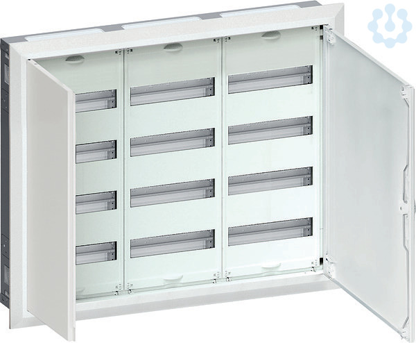 Feldverteiler UP 144PLE mit univers, IP30, SKII, Nischenmaße 657x815x115mm. Feldverteiler UP/HW zertifiziert nach DIN EN 61 439-1/-3, Maßnorm nach DIN 43870. Zum Einbau von Geräten bis 125 A, Luft- und Kriechstrecken nach DIN EN 60664-1, Schutzart IP30. Bestehend aus Schrank, Blendrahmen und Stahlblechtür, pulverbeschichtet in RAL 9010 (reinweiß). Komplettverteiler mit Einbausatz bestückt mit profilierten Tragschienen, 7,5 mm hohen Hutschienen in 125 mm Mittenabstand und passenden Berührungsschutzabdeckungen (SKII) aus Kunststoff, inklusiv 1xPE- und 2xN-QuickConnect-Klemmblöcke auf Träger montiert. Leitungseinführungen oben/unten durch herausnehmbare Kunststoffflanschplatten mit Vorprägungen und integrierte Kabelzugentlastung. Seitlich und hinten ausschlagbare Leistungseinführungen. Tür mit innenliegenden justierbaren Scharnieren und einem Öffnungswinkel von 110°. Türen rechts und links anschlagbar, werkzeuglos wechselbarer Türanschlag. Türverschluss serienmäßig mit Vorreiber und Klappgriff plombierbar. Ab Schrankbreite 800 mm (3-feldig) zwei türiger Aufbau. Rechte Türen maximal 2 Felder breit. Bei Doppeltür mit Stangenverschluss. Blendrahmen Tiefe bzw. Überstand 13 mm. Hinweis: Austauschbare Schließsysteme möglich.