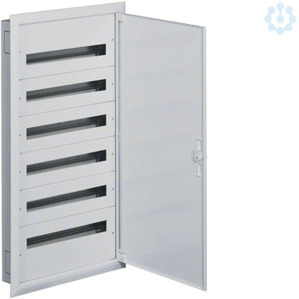 Installationsverteiler,UP,IP30,SKI,6x24PLE,Nischenmaße (HxBxT):1070x550x110mm. Installationsverteiler UP/HW nach OVE/ÖNORM EN 61 439-1/-3 und OVE/ÖNORN 62208. Zum Einbau für Reiheneinbaugeräte bis 125 A. Bestehend aus Mauerwanne, Einbausatz und Tür mit Blendrahmen aus reinweißen pulverbeschichtetem und eingebranntem Stahlblech. Der Einbausatz hat je 2 profilierte Tragschienen, stabile 15mm hohen Hutschienen in 150mm Mittenabstand und passenden reinweißen Berührungsschutzabdeckungen. Großzügiger Raum für die zu- und abgehenden Kabel durch je einen 200mm hohen Bereich. Vorprägungen für die Kabeleinführungen unten, oben sowie seitlich. Tür mit innenliegenden justierbaren Scharnieren und einem Öffnungswinkel von 130°. Tür rechts und links anschlagbar. Weißes formschönes Schlossschild mit Drehriegel - Klappverschluss. Austauschbare Schließsysteme, Kabelabfangschienen sowie verschiedene Klemmen siehe Zubehör.