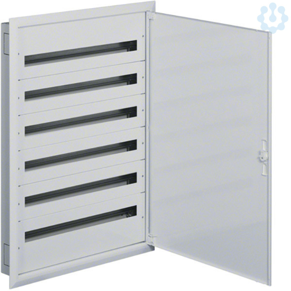 Installationsverteiler,UP,IP30,SKI,6x36PLE, Nischenmaße (HxBxT):1070x766x110mm. Installationsverteiler UP/HW nach OVE/ÖNORM EN 61 439-1/-3 und OVE/ÖNORN 62208. Zum Einbau für Reiheneinbaugeräte bis 125 A. Bestehend aus Mauerwanne, Einbausatz und Tür mit Blendrahmen aus reinweißen pulverbeschichtetem und eingebranntem Stahlblech. Der Einbausatz hat je 2 profilierte Tragschienen, stabile 15mm hohen Hutschienen in 150mm Mittenabstand und passenden reinweißen Berührungsschutzabdeckungen. Großzügiger Raum für die zu- und abgehenden Kabel durch je einen 200mm hohen Bereich. Vorprägungen für die Kabeleinführungen unten, oben sowie seitlich. Tür mit innenliegenden justierbaren Scharnieren und einem Öffnungswinkel von 130°. Tür rechts und links anschlagbar. Weißes formschönes Schlossschild mit Drehriegel - Klappverschluss. Austauschbare Schließsysteme, Kabelabfangschienen sowie verschiedene Klemmen siehe Zubehör.