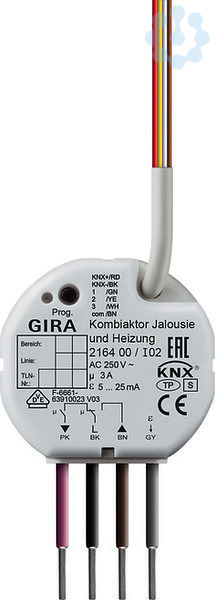 KNX Kombiaktor Jalousie und Heizung Unterputz Merkmale: Eingänge: Freie Zuordnung der Funktionen Schalten, Dimmen, Jalousie und Wertgeber zu den Eingängen. Sperrobjekt zum Sperren einzelner Eingänge. Verhalten bei Busspannungswiederkehr für jeden Eingang separat parametrierbar. Telegrammratenbegrenzung. Funktion Schalten: zwei unabhängige Schaltobjekte für jeden Eingang vorhanden und einzeln freischaltbar, Befehl bei steigender und fallender Flanke unabhängig einstellbar (EIN, AUS, UM, keine Reaktion). Funktion Dimmen: Einflächen- und Zweiflächenbedienung, Zeit zwischen Dimmen und Schalten und Dimmschrittweite einstellbar, Telegramm-Wiederholung und Stopp-Telegramm senden möglich. Funktion Jalousie: Befehl bei steigender Flanke einstellbar (keine Funktion, AUF, AB, UM), Bedienkonzept parametrierbar (Step - Move - Step bzw. Move - Step), Zeit zwischen Kurz- und Langzeitbetrieb einstellbar, Lamellenverstellzeit einstellbar. Funktion Wertgeber und Lichtszenennebenstelle: Flanke (Taster als Schließer, Taster als Öffner, Schalter) und Wert bei Flanke parametrierbar, Wertverstellung bei Taster über langen Tastendruck für Wertgeber möglich, Lichtszenennebenstelle mit Speicherfunktion auch Speicherung der Szene ohne vorherigen Abruf möglich. Der Kombiaktor Jalousie und Heizung ist eine Kombination aus einem Jalousieaktor mit einem Heizungsaktor und verfügt über drei Binäreingänge mit denen sich im Auslieferungszustand die angeschlossene Jalousie, Rolllade, Markise oder Lüftungsklappe steuern lässt. Betriebsart parametrierbar: Jalousien, Rollläden, Markisen oder Lüftungsklappen. Separat parametrierbare Behangfahrzeiten mit Fahrzeitverlängerung für Fahrten in die obere Endlage. Rückmeldung der Behangposition oder der Lamellenposition. Aktive oder passive (Objekt auslesbar) zyklische Rückmeldefunktionen. Zuordnungen auf bis zu fünf verschiedene Sicherheitsfunktionen (drei Windalarme, ein Regenalarm, ein Frostalarm), wahlweise mit zyklischer Überwachung. Sonnenschutzfunktion mit festen und variablen Behang- oder Lamellenpositionen aktivierbar. Einbindung in komplexe Beschattungssteuerungen, wahlweise mit Heizen Kühlen-Automatik und Präsenzfunktion. Verhalten bei Busspannungsausfall und -wiederkehr einstellbar. Rückmeldungen lassen sich nach Busspannungswiederkehr verzögern. Zwangsstellungsfunktion für jeden Jalousieausgang realisierbar. Einbeziehung in Szenen möglich, max. acht interne Szenen je Kanal sind parametrierbar. Speicherfunktion für Lichtszenen. Ausgang, ansteuerbar durch eine Stellgröße (1 Bit oder 1 Byte). Statusrückmeldung (1 Bit bzw. 1 Byte) automatisch oder auf Leseanforderung. Ventilansteuerung (spannungslos geöffnet geschlossen) parametrierbar. Sommer- oder Winterbetrieb über ein Objekt wählbar. Zyklische Überwachung der Stellgröße: bleibt ein Stellgrößentelegramm innerhalb einer Überwachungszeit aus, wechselt der Ausgang in den Notbetrieb und es wird eine Alarmmeldung gesendet. Jeder Ausgang kann in eine Zwangsposition (Zwangsstellung) verriegelt werden, für Sommer- und Winterbetrieb unterschiedliche Werte möglich. Verhalten bei Busspannungswiederkehr und -ausfall für jeden Ausgang separat parametrierbar. Überlast bzw. Kurzschlussmeldung über ein Objekt einstellbar. Steuerung der Stellantriebe im Schaltbetrieb oder PWM-Betrieb. Schutzfunktion gegen festsitzendes Ventil. Hinweise : Montage in Gerätedosen nach DIN 49073. Der Anschluss der Ausgänge erfolgt über eine flexible ca. 20 cm lange Leitung. Der Anschluss der Binäreingänge und des KNX Busses erfolgt über eine 6-adrige ca. 30 cm lange Anschlussleitung, die auf max. 5 m verlängert werden kann. VDE-Zulassung gemäß EN 60669-1, EN 60669-2-1.