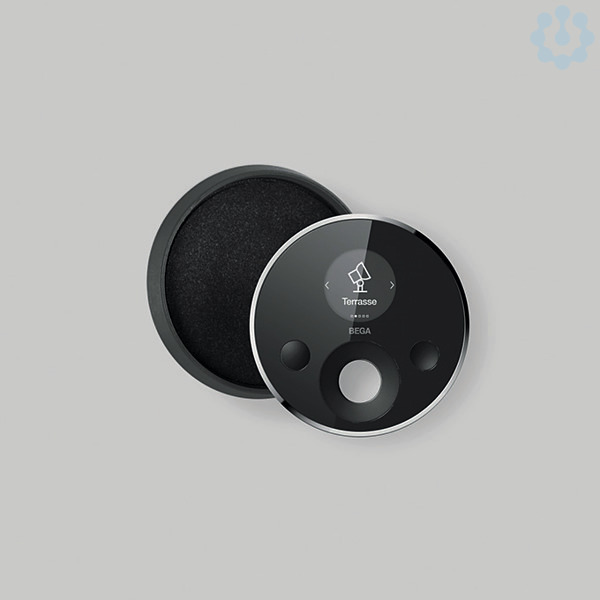 BEGA Remote Control PRO 13569. Die Fernsteuerung bietet eine Menüsteuerung per Display und Touchring. Zwei frei programmierbare Favoritentasten ermöglichen darüber hinau den Schnellzugriff auf beliebte Szenen. Gehäuse aus mattschwarz eloxiertem Aluminiumguss. Inklusive magnetischer Wandhalterung. Front aus bruch- und kratzfestem Gorilla® Glas. Zigbee 3.0. Funkreichweite im freien Feld 30 m. Konfiguration via App BEGA Smart.