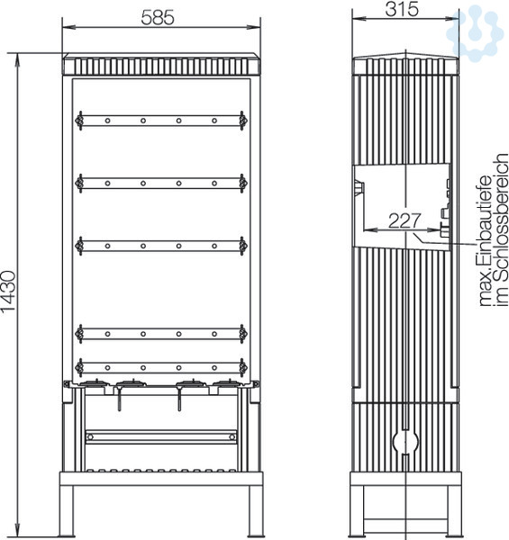 Festplatzverteilerschrank Gr.0, mobil mit Standfuss, mit SaS 30x6mm, 5-polig. Mobiler Stromverteilerschrank für Fest- und Markplätze, mit Festplatz-Aufbausockel, Schutzart IP 44, aus glasfaserverstärktes Polyester FS 833.5 nach DIN EN 14598 mit Recyclat. Die DIN VDE 0100 Teil 722 regelt die Installation für fliegende Bauten, Wagen und Wohnwagen nach Schaustellerart. Festplatzverteilerschrank mit Sammelschienen-System zum Einbau von Steckdosenleisten zur individuellen Bestückung. Profiliertes Gehäuse im Rippendesign. Mit Sammelschienen-System 5-polig E-Cu 30 x 6 mm. Tür mit Öffnungswinkel 180 Grad bei freiem Stand und 90 Grad bei angereihten Gehäusen. Türen sind aushängbar, Türanschlag links oder rechts möglich. Schließung mit Schwenkhebel, Drei-Punkt-Basküleverschluss, Doppelschließung, ein Profilhalbzylindern ist eingebaut. Die Belüftung erfolgt über labyrinthartig ausgebildete Lüftungskanäle und ist durch Eindringen von Fremdkörpern stochersicher. Profilierter Festplatz-Aufbausockel im Rippendesign, mit Steckschieber und C-Profilschiene zur Kabelbefestigung. Hinweis: Aufbausockel für Abdeckblende aus feuerverzinktem Stahlblech als Zubehör. Beim Einbau von Steckdosenleisten in Festplatzverteilerschränken und Säulen, zu deren Bedienung Laien Zutritt haben, ist vom Errichter der Anlage der Schutz gegen direktes Berühren sicherzustellen.