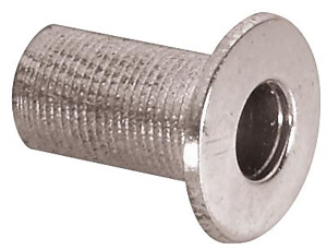 Montagehülse zu 975100, chrom, rund. Material: Messing, Aussendurchmesser: Ø 9 mm, Höhe Außenring: 1 mm, Einbautiefe ohne 975100: 8 mm, Einbautiefe mit 975100: 20 mm, Bohrdurchmesser: Ø 5 mm bis Ø 5,5 mm - je nach Material, Befestigungsart: Kleben (mit Brumberg-Kleber 48290000).
